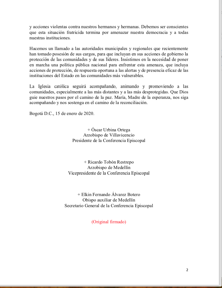 A continuación texto completo Comunicado de la Conferencia Episcopal de Colombia-CEC: