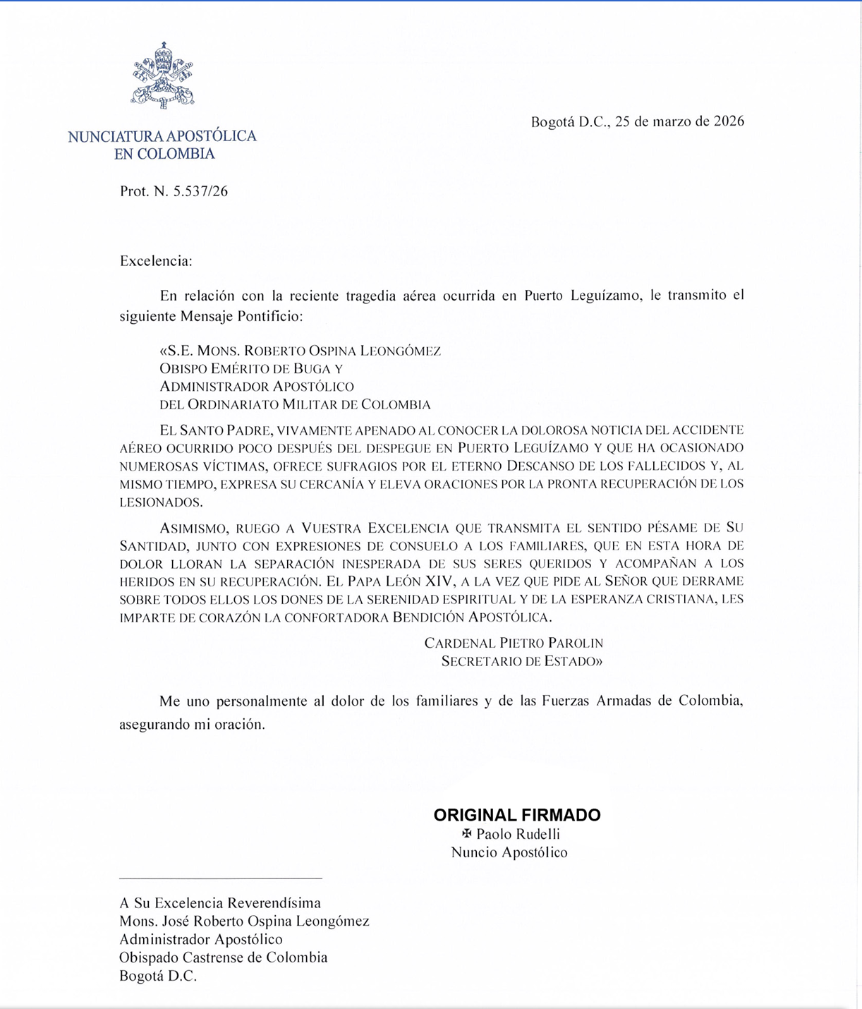 El Papa León XIV expresó su profundo pesar y cercanía espiritual con las víctimas del accidente aéreo ocurrido el pasado 23 de marzo en Puerto Leguízamo, Putumayo, que dejó al menos 68 personas fallecidas y decenas de heridos. El mensaje fue transmitido por la Nunciatura Apostólica en Colombia, a través de una carta dirigida a monseñor José Roberto Ospina Leongómez, obispo emérito de Buga y administrador apostólico del Obispado Castrense.