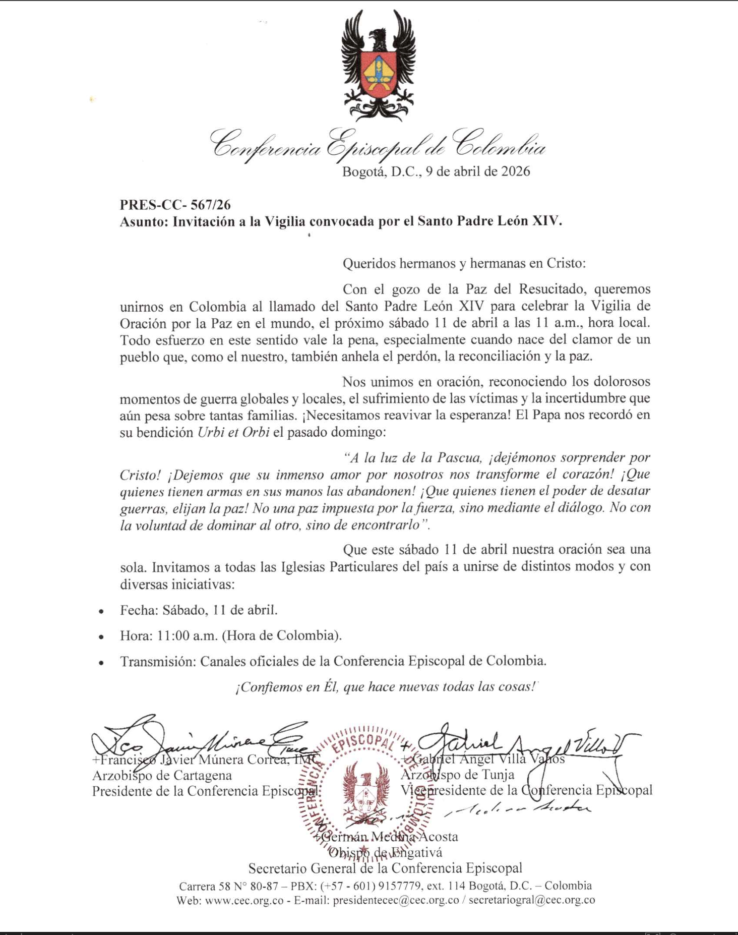 En medio de la violencia que afecta a Colombia y a distintas regiones del mundo, la Conferencia Episcopal de Colombia (CEC) llama a los fieles católicos a unirse el próximo sábado 11 de abril a la Vigilia de Oración por la Paz, convocada por el Papa León XIV. La celebración central se realizará en el Vaticano, en la Basílica de San Pedro, a las 6:00 p.m. (hora Roma) y 11:00 a.m. (hora Colombia). Será retransmitida a través de la página en facebook y el canal en YouTube de la CEC.