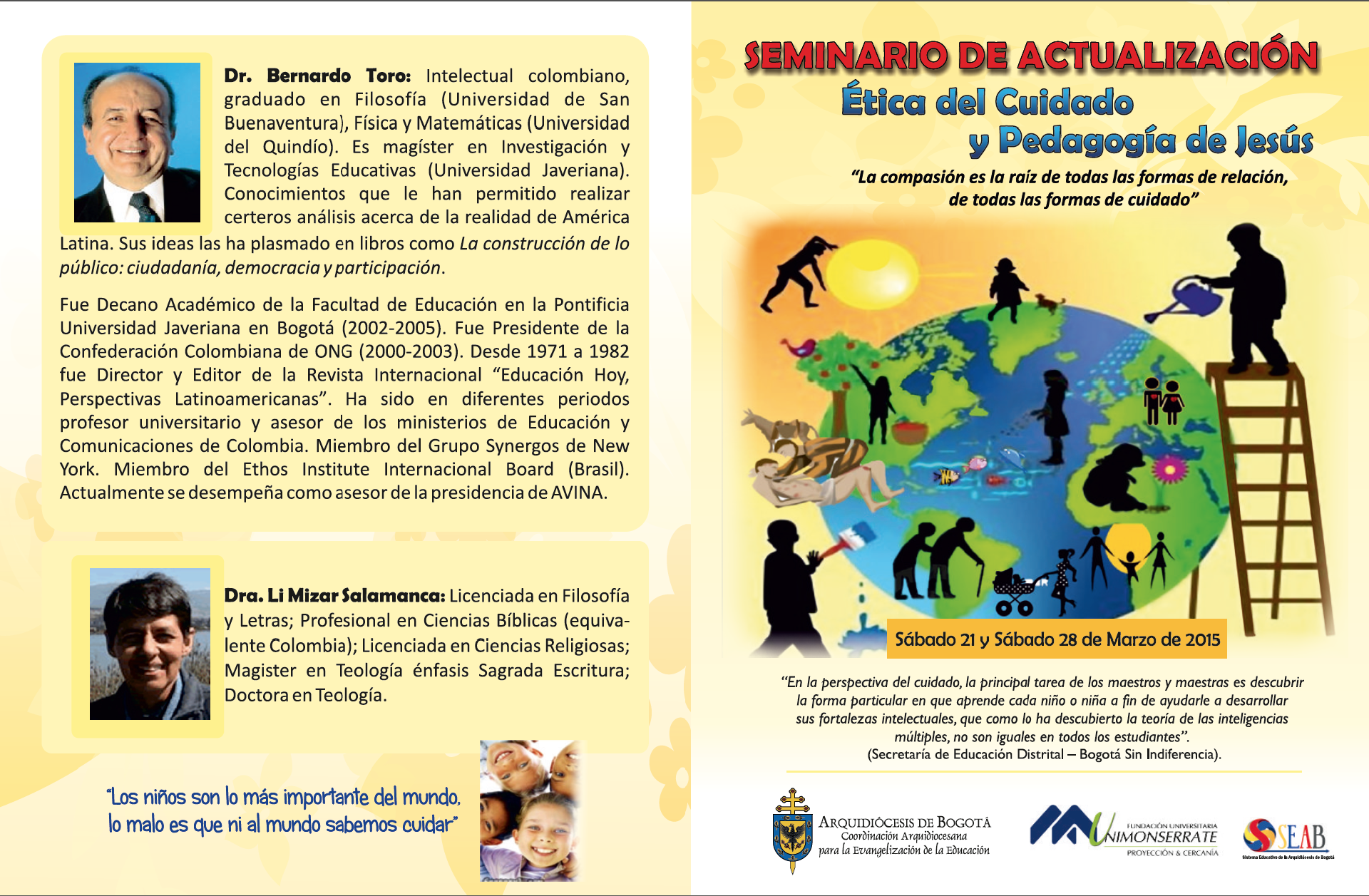 Para este proceso de actualización contamos con la iluminación del Dr. Bernardo Toro profesional de larga experiencia en su compromiso con una sociedad más ética y justa desde los distintos ámbitos sociales e institucionales en que él aporta luces fuertemente significativas. La Dra. Li Mizar Salamanca quien desde su formación teológica y de lectura de realidad nos fundamenta su propuesta desde el Evangelio de Jesús para la ética del cuidado. Todo ello en consonancia con el nuevo paradigma de evangelización del Plan E de nuestra Arquidiócesis de Bogotá.