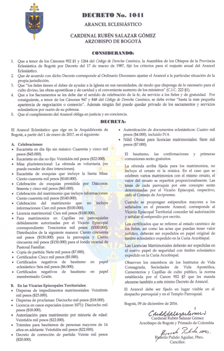 El señor cardenal Rubén Salazar Gómez ha expedido el decreto del Arancel Eclesiástico anual