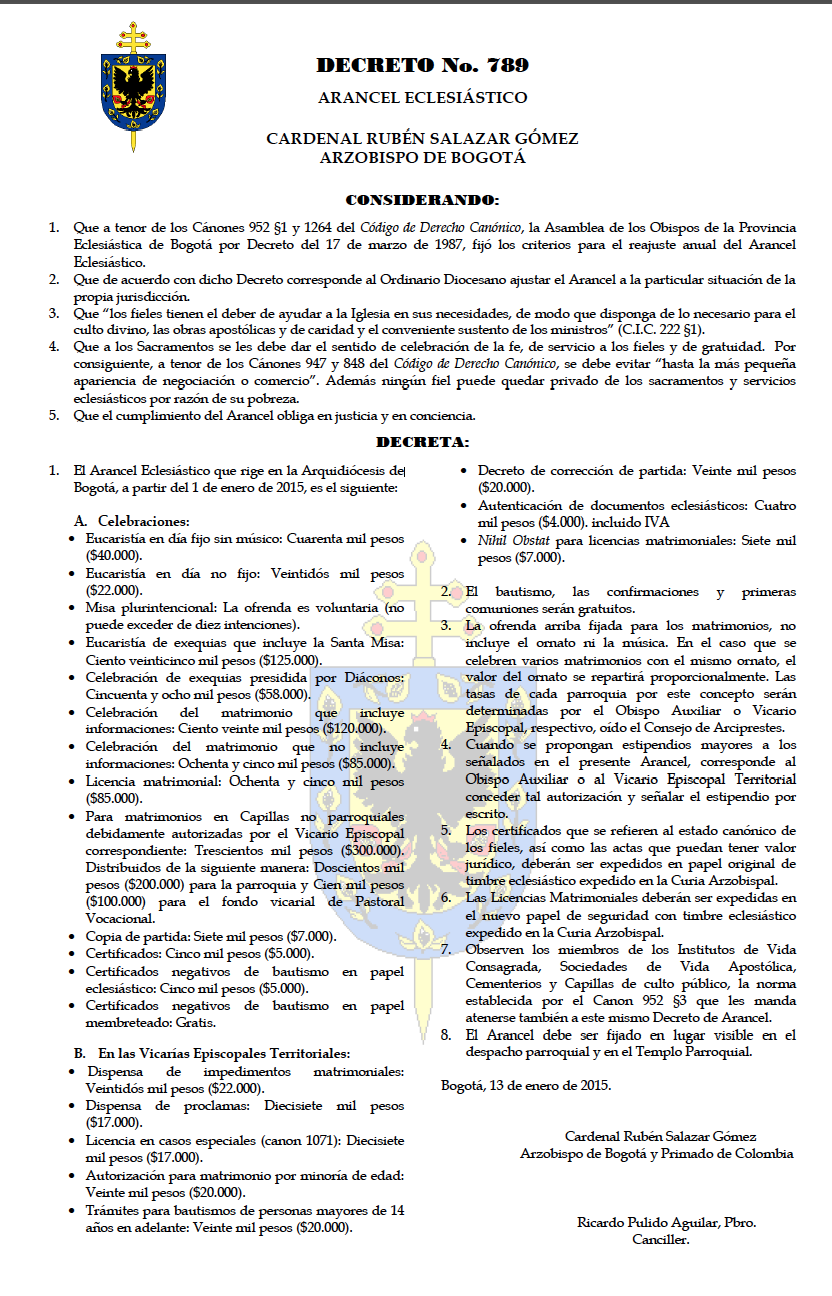 El Arancel Eclesiástico que rige en la Arquidiócesis de Bogotá, a partir del 1 de enero de 2015, es el siguiente: