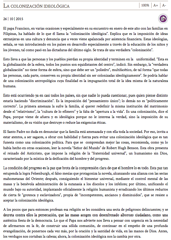 El Papa ha hablado sobre las nuevas formas de colonización, entre las que destaca la colonización ideológica, la cual radica en la imposición de estructuras o programas…
