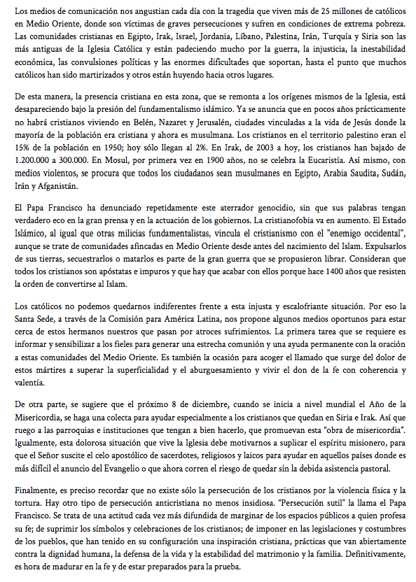 Los medios de comuniación nos angustian cada día con la tragedia que viven más de 25 milones de católicos, en medio Oriente, donde son víctimas de persecuciones y sufren…