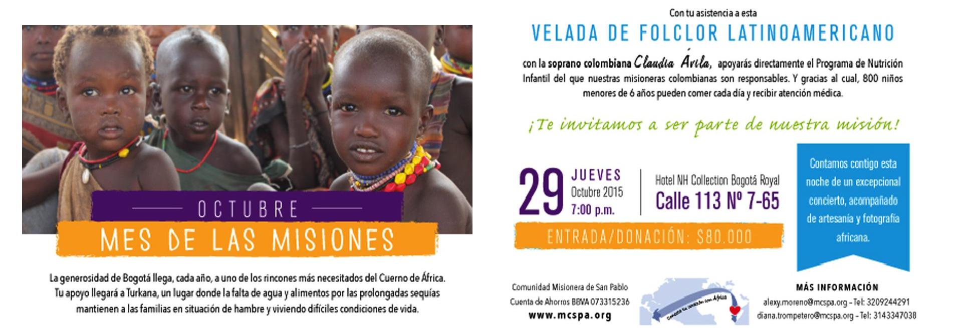 La invitación en este mes de las misiones es para apoyar esta misión adyente el próximo jueves 29 de octubre en una Velada de Folckor, a las 7.00 p.m. Hotel NH Collection Bogotá Royal. Calle 113 N°7 – 65, ver invitación: