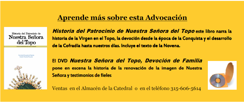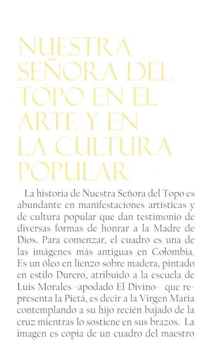 Un Domingo la pequeña ermita pareció incendiarse pero quienes corrieron hacia ella vieron con estupor que los grandes resplandores de luz emanaban del cuadro. Por esta razón se dispuso que se trajesé la imagen a Bogotá, donde fue recibida con una gran procesión y se le dedicó una Capilla especial en la Catedral. En 1854, el Capitán Leonidas Posada Gutiérrez, fiel devoto de la Virgen del Topo fue salvado milagrosamente de la muerte y prometió que él y sus descendientes promoverían la devoción a la Virgen del Topo. Aún hoy esta promesa sigue viva.