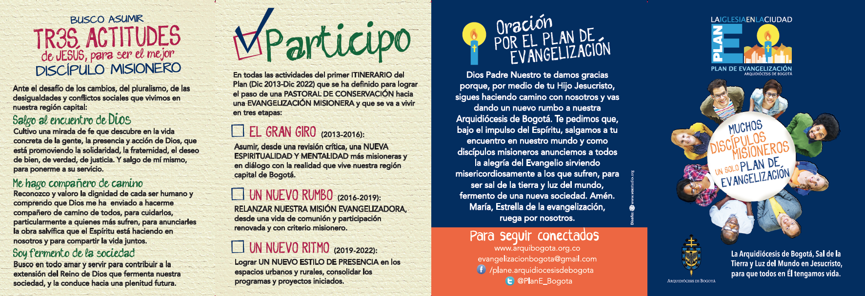- Promover el Plan de Evangelización - “Plan E”, de la arquidiócesis de Bogotá con testimonios que comuniquen ser sal de la tierra y luz del mundo en Jesucristo, para que todos en Él tengamos vida.