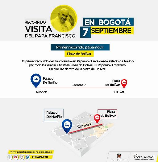 El primer recorrido del día en papamóvil será desde la Casa de Nariño por la Carrera Séptima hasta la Plaza de Bolívar. Luego, el Santo Padre realizará un circuito dentro de la Plaza de Bolívar.