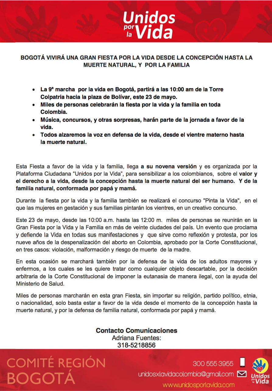 Bogotá vivirá una gran fiesta por la vida desde la concepción hasta la muerte natural,y por la familia