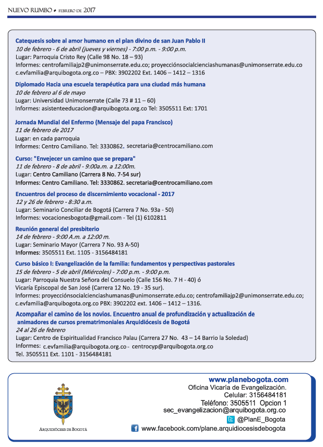 Oficina Vicaría de Evangelización. Llámanos 350 55 11. Ext: 1105 o escríbenos: sec_evangelizacion@arquibogota.org.co