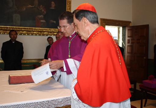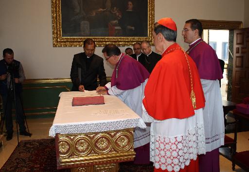 La ceremonia empieza con el juramento de los llamados al episcopado, el cual tuvo lugar en la capilla de la Curia. Allí ante la presencia de Dios y del Cardenal, de los presbíteros acompañantes y de los Vicarios Episcopales recitan el credo y firman los decretos: