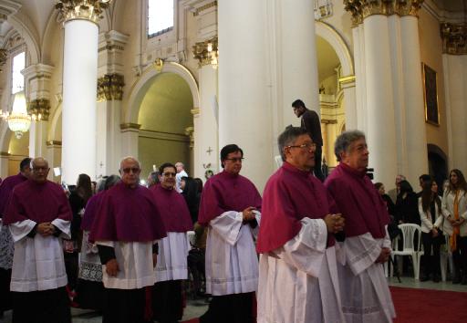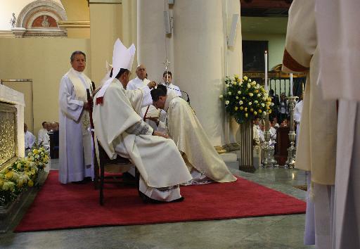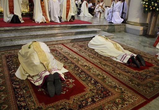 La eucaristía comienza con la procesión hacia el altar y después de la homilía, con el canto del himno Veni creator Spiritus empieza el rito de ordenación: