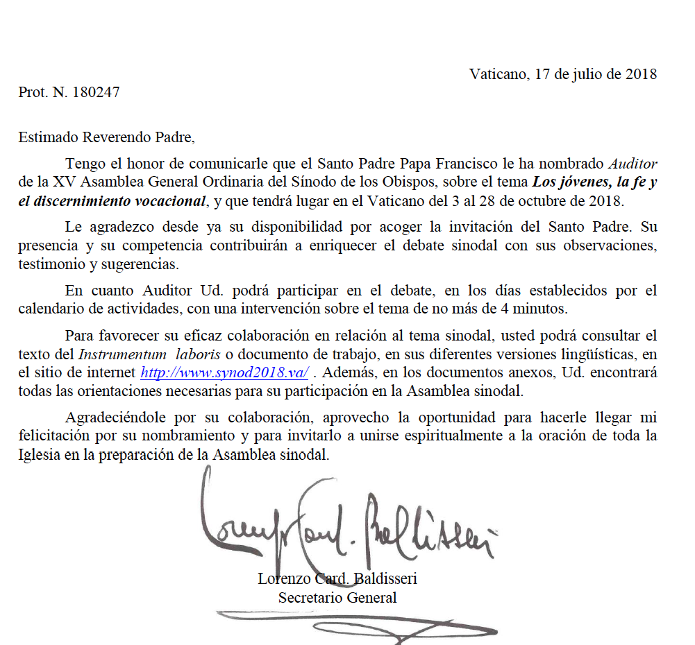 En nombre del Señor Cardenal Rubén Salazar Gómez, me permito informar que el pasado 17 de julio de 2018, el Santo Padre Papa Francisco, ha nombrado al Padre Carlos Iván Martínez Urrea, Auditor de la XV Asamblea General Ordinaria del Sínodo de Obispos, sobre el tema Los jóvenes, la fe y el discernimiento vocacional, que tendrá lugar en el Vaticano del 3 al 28 de octubre de 2018.