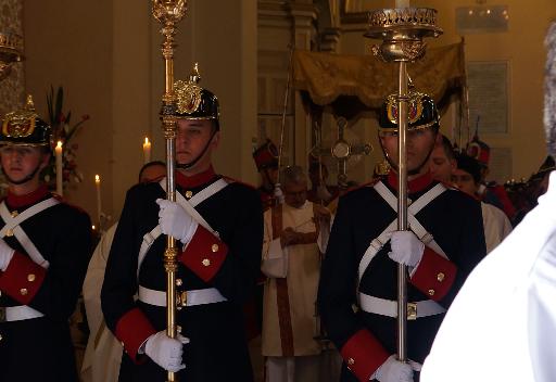 Este año la procesión fue dentro de la catedral debido a las obras que hacen sobre la carrera Séptima, desde hace casi un año. La comunidad de la Hijas de la Iglesia preparó los altares y a la comunidad para esta celebración presidida por monseñor Alberto Ayala López, párroco de la Catedral; la Schola pueri cantorum acompañó bellamente la celebración, al igual que miembros del Batallón Guardia Presidencial, quienes portaron el Palio, hicieron calle de honor y la banda de músicos interpretó algunas canciones eucarísticas.