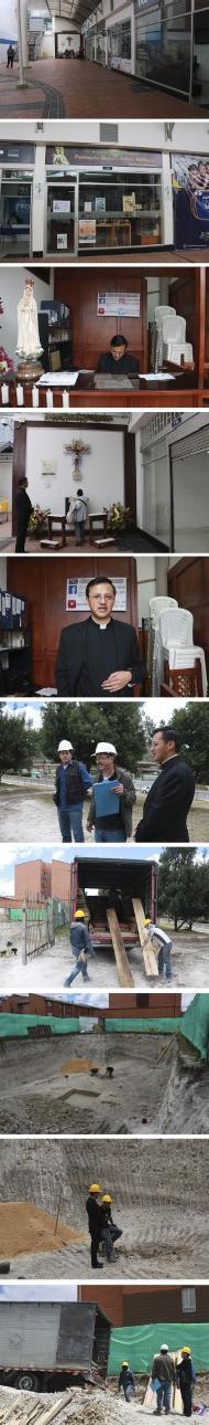 Sobre la plazoleta hay varios locales comerciales, el 1-51 es el despacho parroquial. El Catolicismo llegó un martes a las 9 de la mañana y se encontró con el padre Eduar muy diligente en sus labores administrativas y pastorales, a todos saluda, es que todos lo conocen. Ha celebrado con ellos la Eucaristía, las primeras comuniones, los bautismos, sus matrimonios y los ha consolado en sus duelos. Ahora han comenzado su templo.