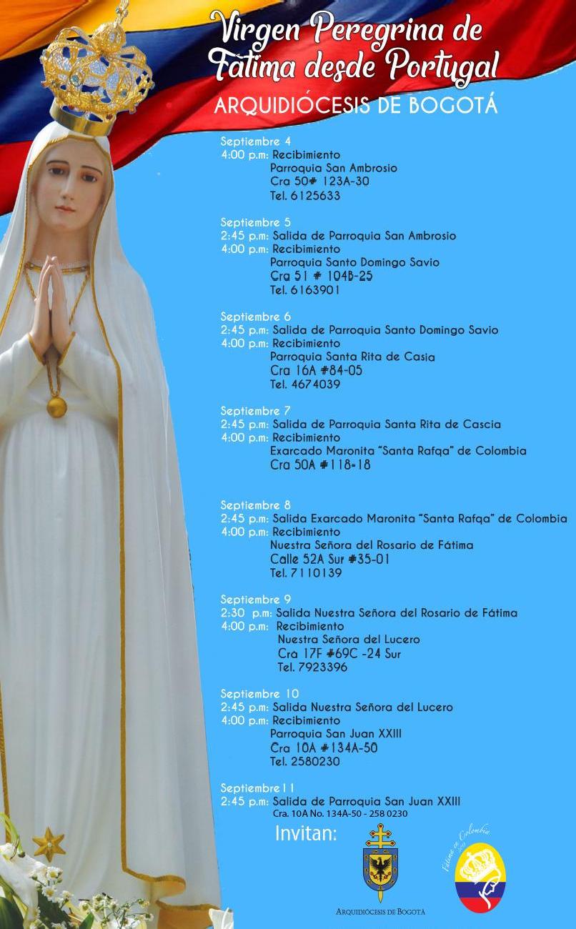 En el mes de septiembre, la arquidiócesis de Bogotá, contará con su presencia. Esta es una imagen consagrada, bendecida y autorizada desde el Santuario de Fátima, dentro de las 12 replicas que se encuentran peregrinando alrededor del mundo.