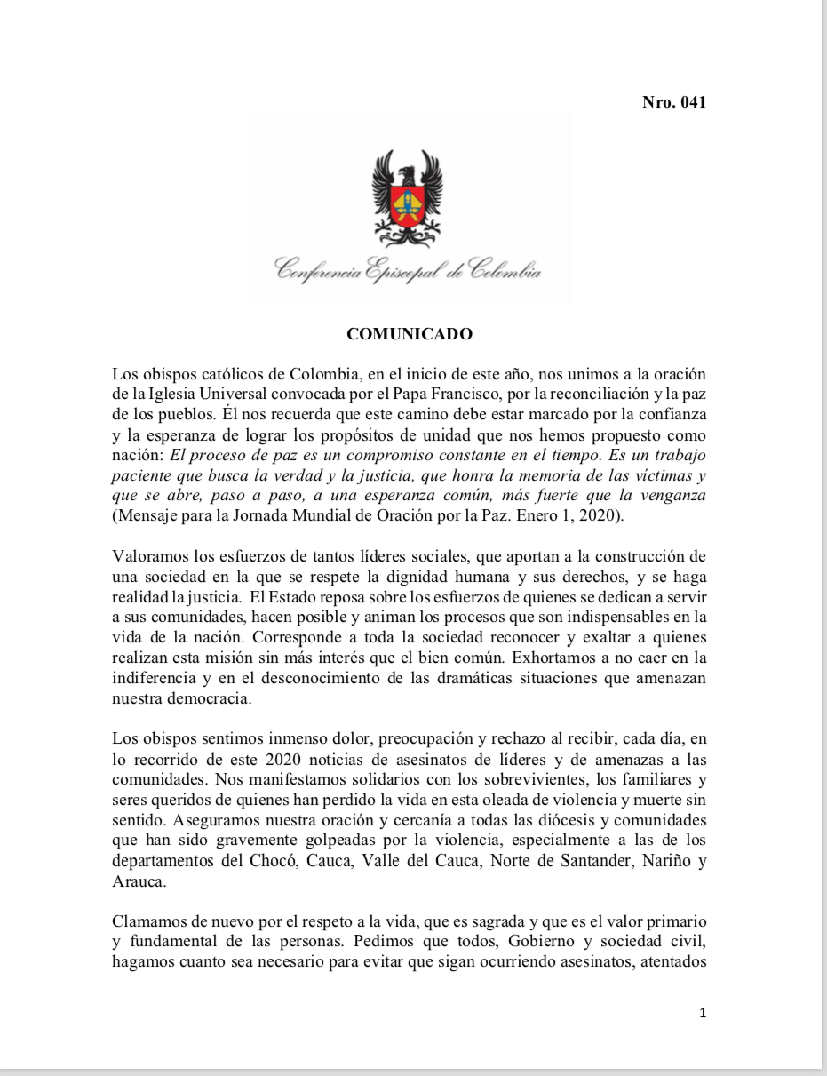 A continuación texto completo Comunicado de la Conferencia Episcopal de Colombia-CEC: