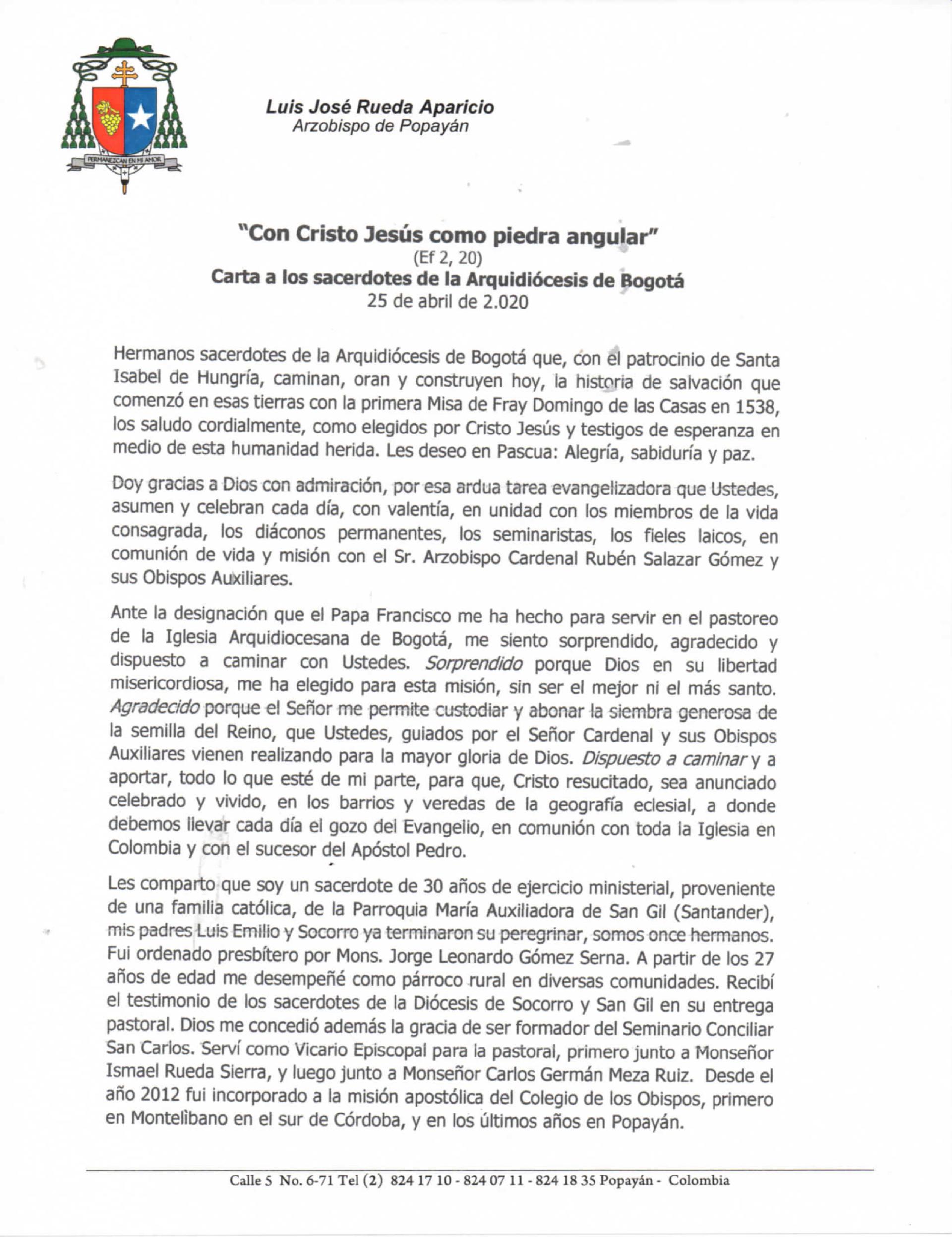 A continuación, texto completo de la carta que monseñor Luis José Rueda Aparicio dirigió al clero arquidiocesano en su nombramiento como nuevo arzobispo de la arquidiócesis de Bogotá:
