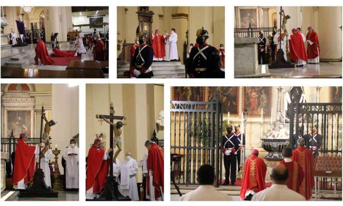 Así empezó esta celebración de la Pasión del Señor, que no tuvo mayores modificaciones, salvo la adoración de la Santa Cruz, que se hizo con una profunda reverencia y a lo lejos.