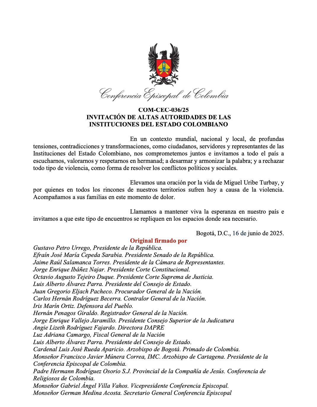 “Elevamos una oración por la vida de Miguel Uribe Turbay, y por quienes en todos los rincones de nuestros territorios sufren hoy a causa de la violencia”, señala el texto, que también exhorta a mantener viva la esperanza y a replicar estos encuentros de unidad en otros contextos del país donde sean necesarios.