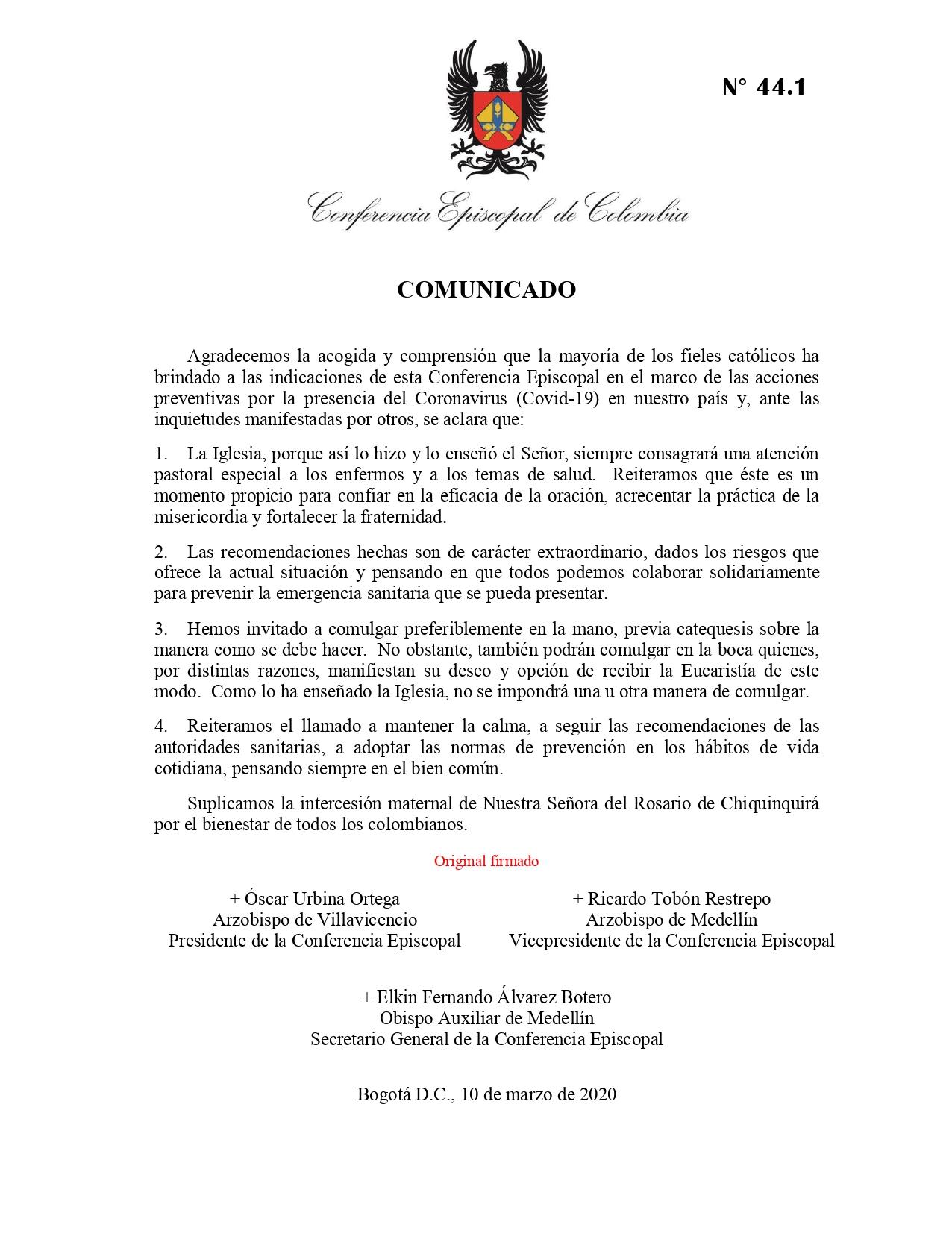 Pensando en el bien común y siguiendo las recomendaciones hechas por las autoridades sanitarias frente a la presencia del Coronavirus (Covid-19) en nuestro país, la Conferencia Episcopal de Colombia (CEC) reitera el llamado a mantener la calma y señala que la Iglesia “siempre consagrará una atención pastoral especial a los enfermos y a los temas de salud”.
