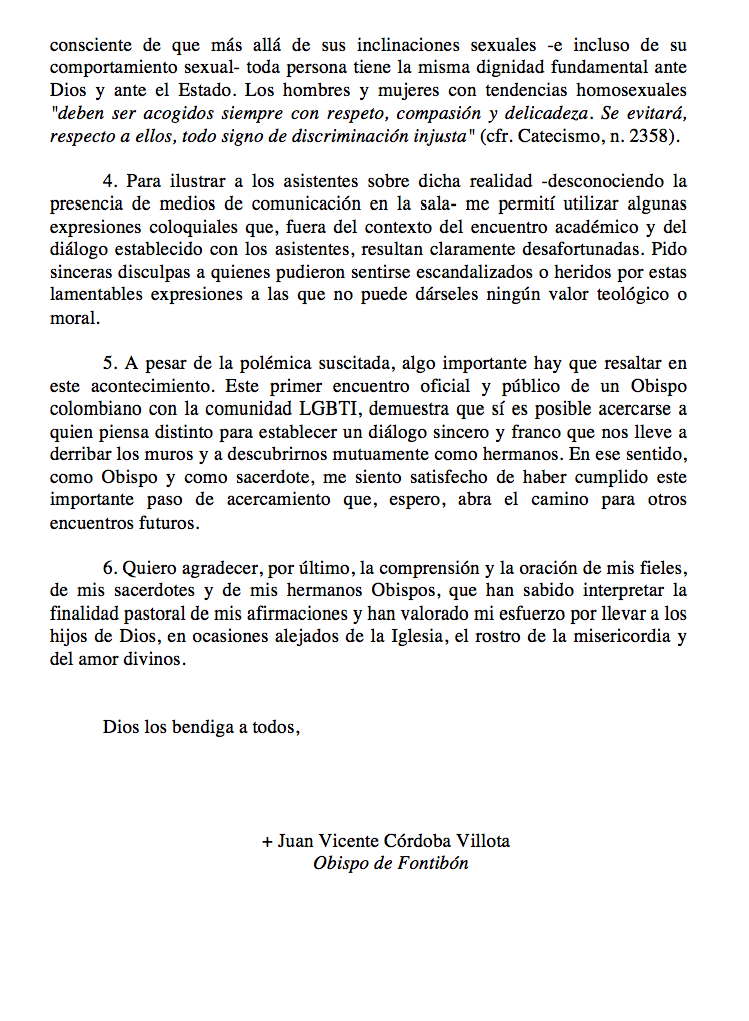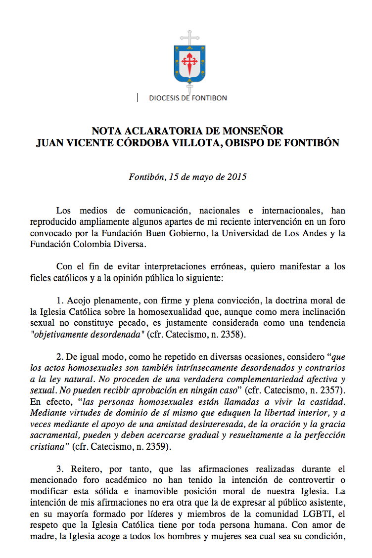 Carta aclaratoria de monseñor Juan Vicente Córdoba sobre el foro convocado por la Fundación Buen Gobierno, la Universidad de Los Andes y la Fundación Colombia Diversa.