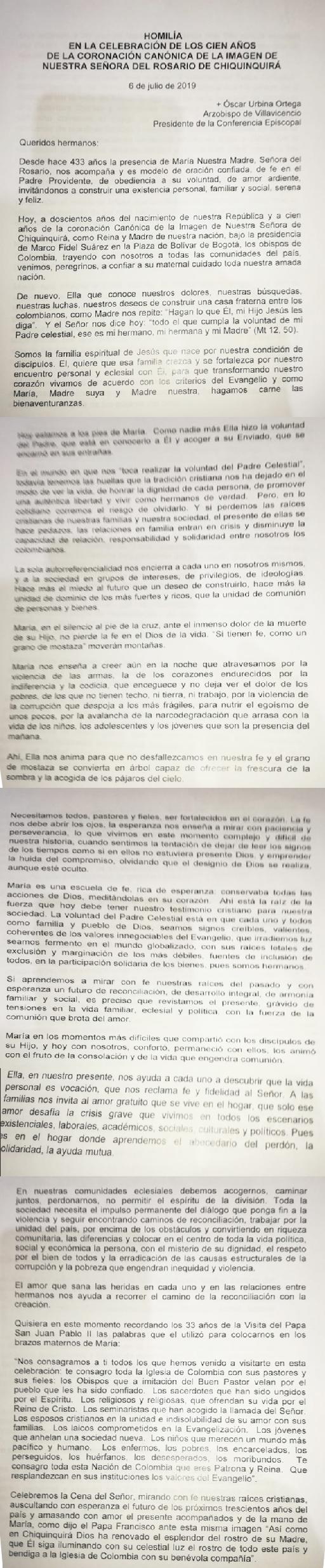 La ceremonia estuvo presidida por monseñor Óscar Urbina Ortega, presidente de la Conferencia Episcopal de Colombia y concelebraron en el altar el nuncio, monseñor Mariano Montemayor, el señor cardenal Rubén Salazar Gómez y el obispo de Chiquinquirá, monseñor Luis Felipe Sánchez Aponte.