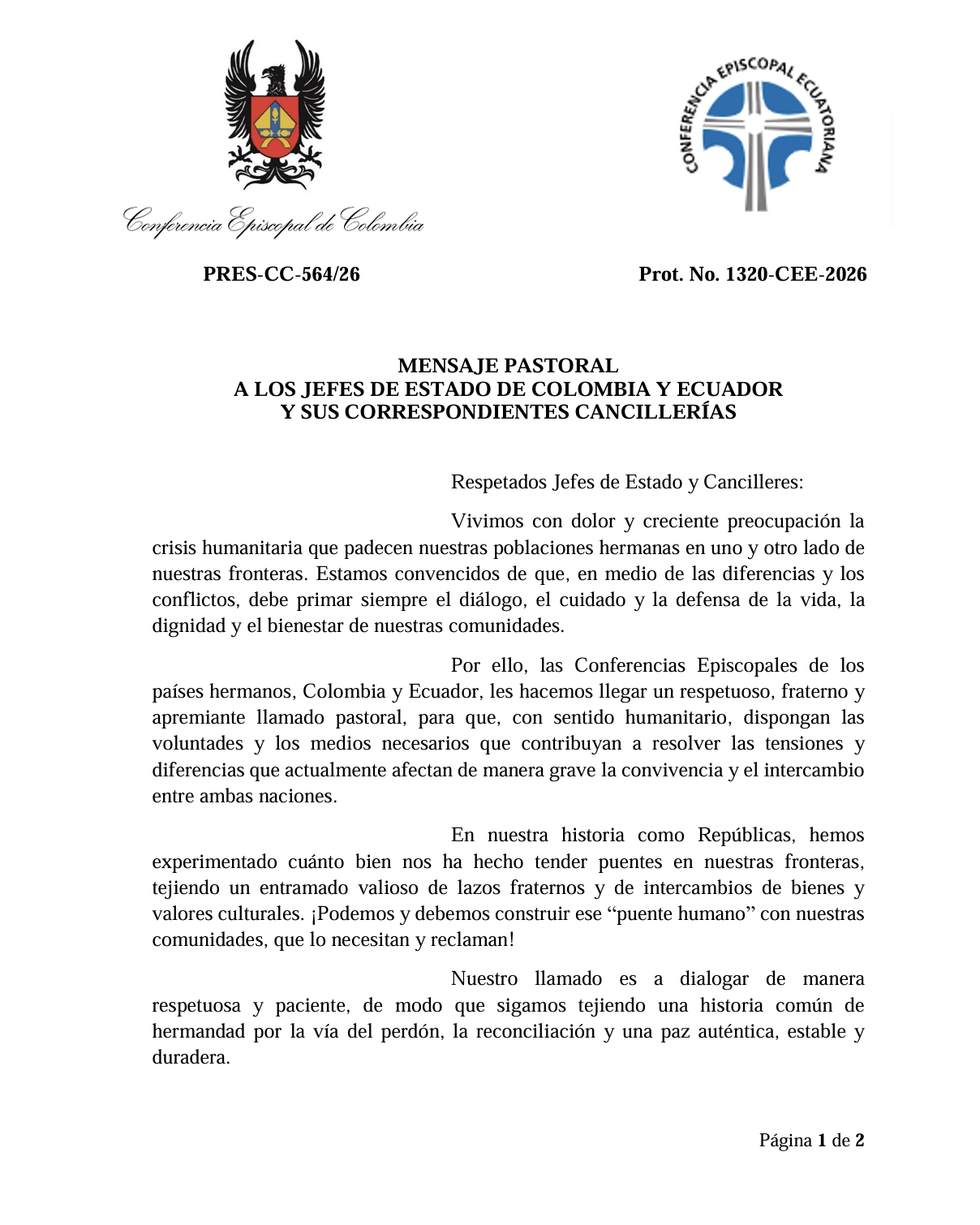 En un mensaje pastoral conjunto, la Conferencia Episcopal de Colombia (CEC) y la Conferencia Episcopal Ecuatoriana hacen un llamado “respetuoso, fraterno y apremiante” a los gobiernos de ambos países para que, con sentido humanitario, dispongan las acciones necesarias que permitan superar las tensiones actuales y restablecer la convivencia en la frontera.