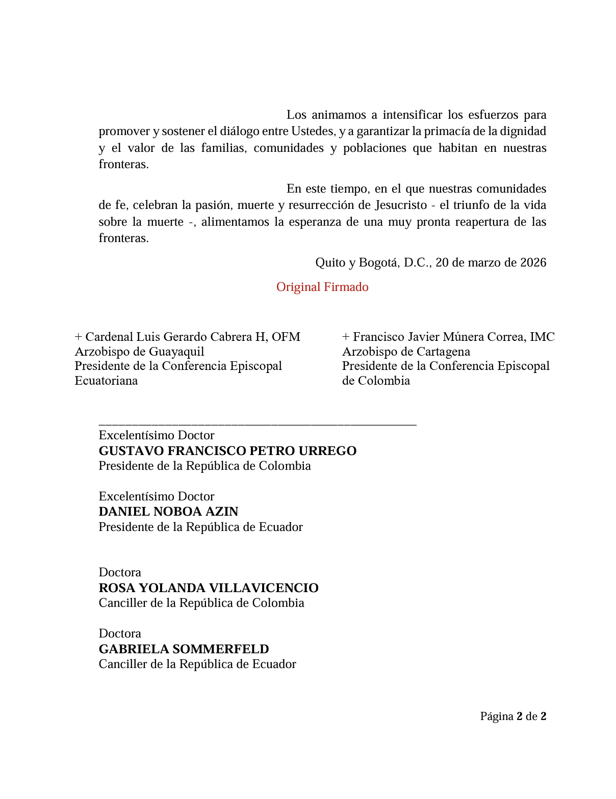 Este llamado, firmado por monseñor Francisco Javier Múnera Correa, IMC (Presidente de la Conferencia Episcopal de Colombia) y por el cardenal Luis Gerardo Cabrera Herrera, OFM (Presidente de la Conferencia Episcopal Ecuatoriana), reafirma la opción pastoral de la Iglesia de ponerse del lado de las personas, especialmente de quienes sufren las consecuencias de las tensiones entre los Estados.