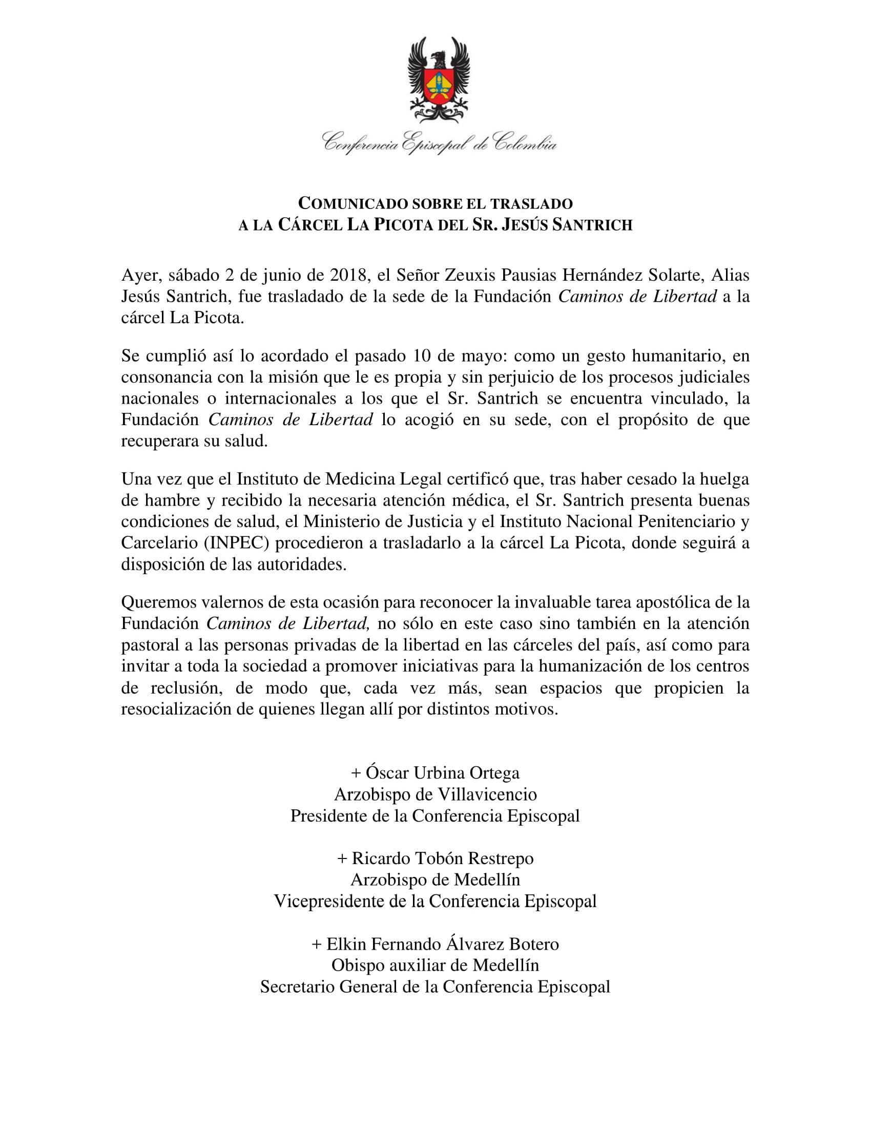 Presentamos el comunicado oficial de la Conferencia Episcopal de Colombia, tras el traslado del señor Zeuxis Pausias Hernández Solarte, Alias Jesús Santrich, a la cárcel…