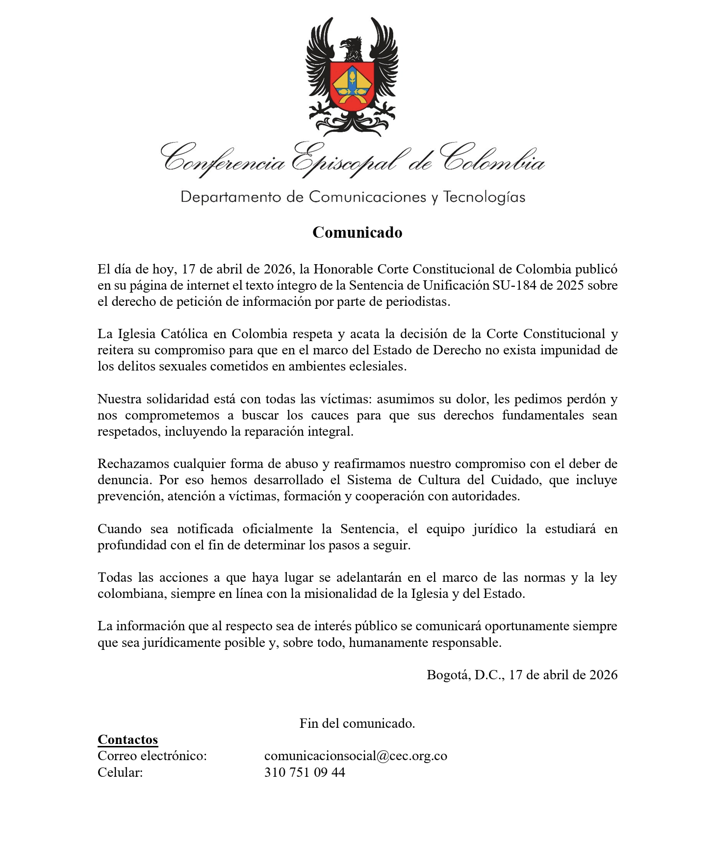 La Conferencia Episcopal de Colombia, a través de su Departamento de Comunicaciones, da a conocer el primer comunicado oficial a propósito de la publicación de la Sentencia de Unificación SU-184 de 2025 por parte de la Corte Constitucional, relacionada con el derecho de petición de información por parte de periodistas.