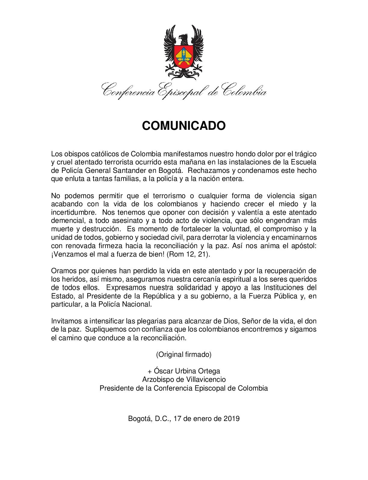 En un comunicado firmado por el presidente de la Conferencia Episcopal de Colombia, monseñor Óscar Urbina Ortega, los obispos católicos de este país manifiestan su…
