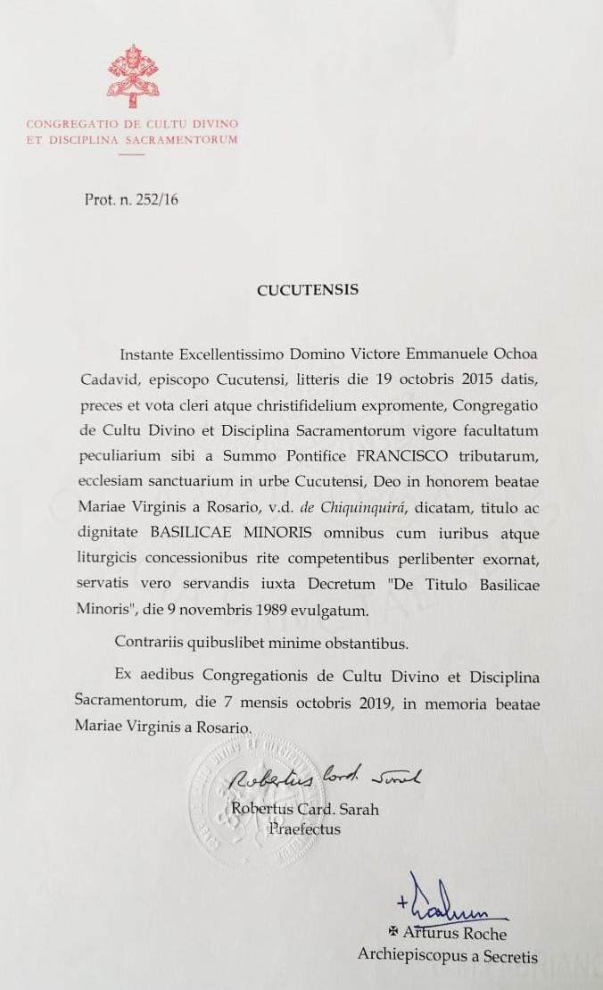Más conocido como el Santuario de Nuestra Señora del Rosario de Chiquinquirá, ‘La Kacika de Cúcuta’, ahora es la primera Basílica en Norte de Santander. “Es una noticia muy alegre, con la que el Papa Francisco honra a esta parroquia, a sus fieles y a Cúcuta”, expresó el Obispo.