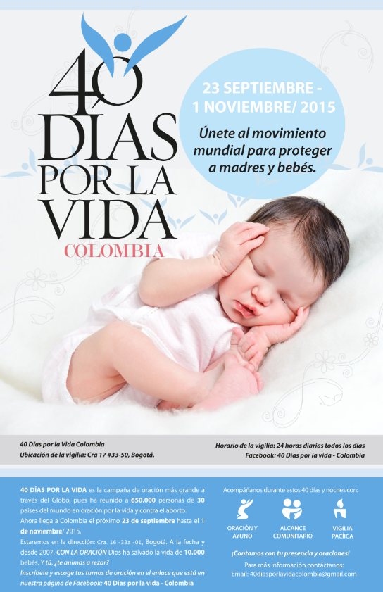 Mayores informes e inscripciones: correo 40diasporlavidacolombia@gmail.com o comuníquese al celular: 322 341 75 15.