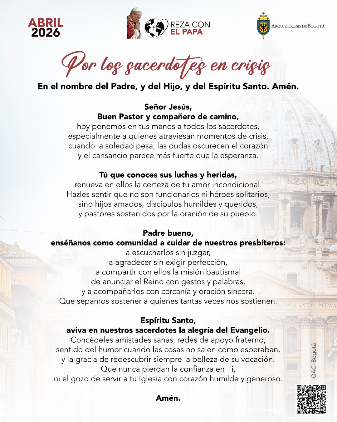 En su oración, el Papa dirige una súplica profunda por los sacerdotes que atraviesan momentos de dificultad “cuando la soledad pesa, las dudas oscurecen el corazón y el cansancio parece más fuerte que la esperanza” y recuerda que los presbíteros “no son funcionarios ni héroes solitarios, sino hijos amados, discípulos humildes y queridos, y pastores sostenidos por la oración de su pueblo”. Además, el Pontífice subraya la importancia de redescubrir la dimensión comunitaria del ministerio sacerdotal. En particular, invita a los fieles a “escuchar sin juzgar, agradecer sin exigir perfección y acompañar con cercanía y oración sincera”, reconociendo que el cuidado de los sacerdotes es una responsabilidad compartida por todo el Pueblo de Dios. En su oración, el Papa pide especialmente que los sacerdotes puedan contar con “amistades sanas, redes de apoyo fraterno” y la gracia de redescubrir la belleza de su vocación.