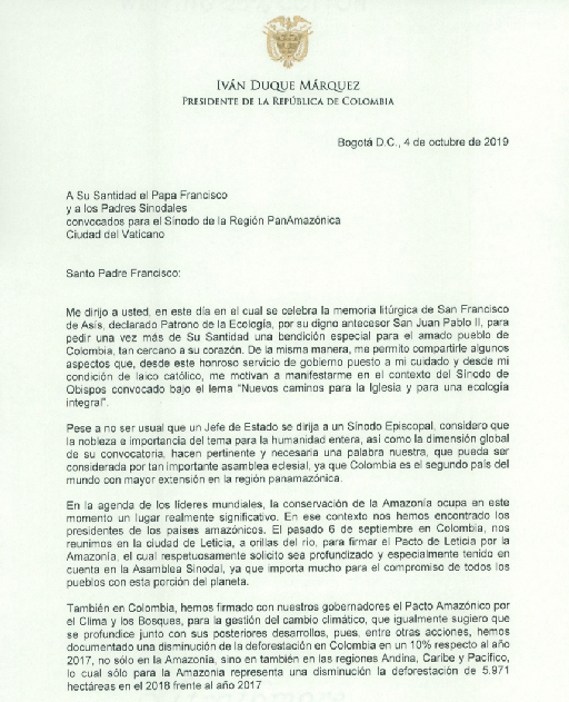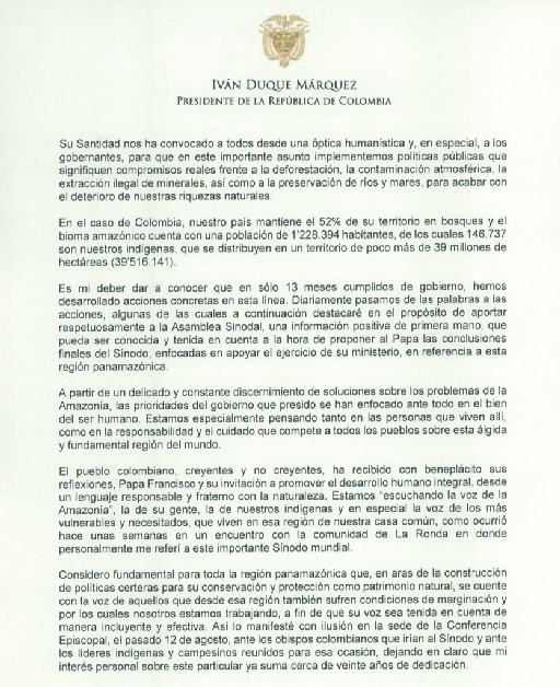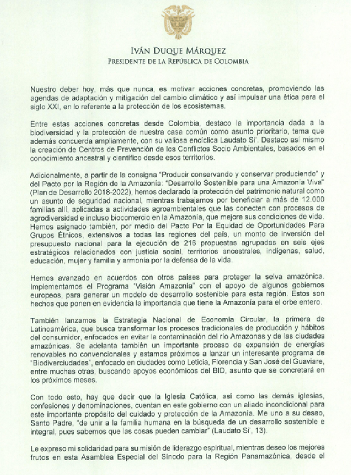 Mensaje del presidente de Colombia Iván Duque enviado al papa Francisco y a los asistentes del Sínodo de la Amazonia en la ciudad del vaticano...