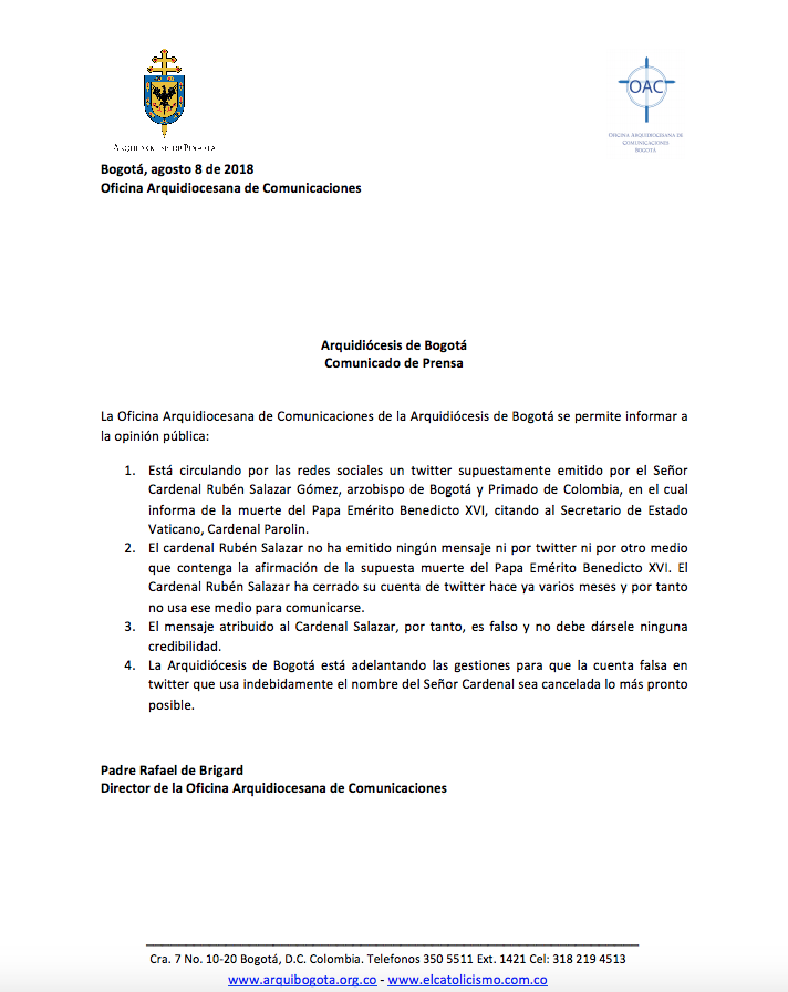 La Oficina Arquidiocesana de Comunicaciones de la Arquidiócesis de Bogotá se permite informar a la opinión pública que el twitter supuestamente emitido por el Señor…