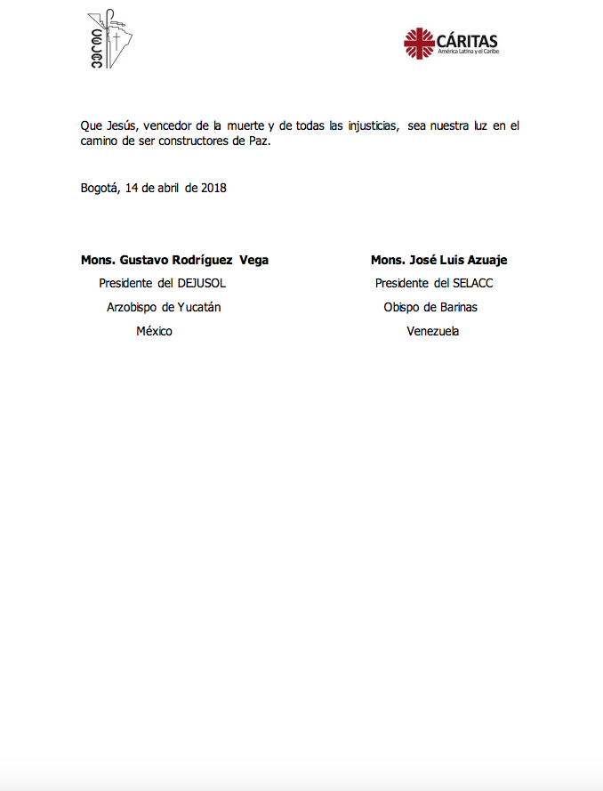 Así también, el DEJOSUL y la SELACC animan a la comunidad católica en América Latina y EL Caribe, a otras comunidades de fe y a los hombres y mujeres de buena voluntad "que se sumen a este llamamiento y, en la medida de lo posible, organicen momentos de oración, reflexión y solidaridad por la paz en Siria, haciendo partícipes a los mismos hermanos y hermanas de Siria como también pedimos a la comunidad internacional que dejando a un lado intereses políticos y económicos se empeñe en construir la paz con justicia, entendiendo que la paz es camino de la