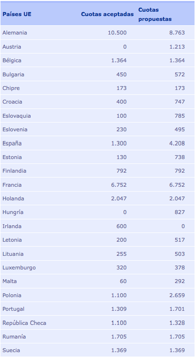 Buena parte de los que sí admitirán a inmigrantes lo harán, sin embargo, en límites mucho menores que las cantidades propuestas por la Comisión Europea. Así, España aceptará a 1.300, de los 4.288 que le hubieran correspondido. Polonia aceptará a 1.100 de 2.659, y Eslovaquia, a 100 de 785. Otros, como Francia, Suecia y Holanda, han optado por ceñirse estrictamente a la cifra que les han propuesto.