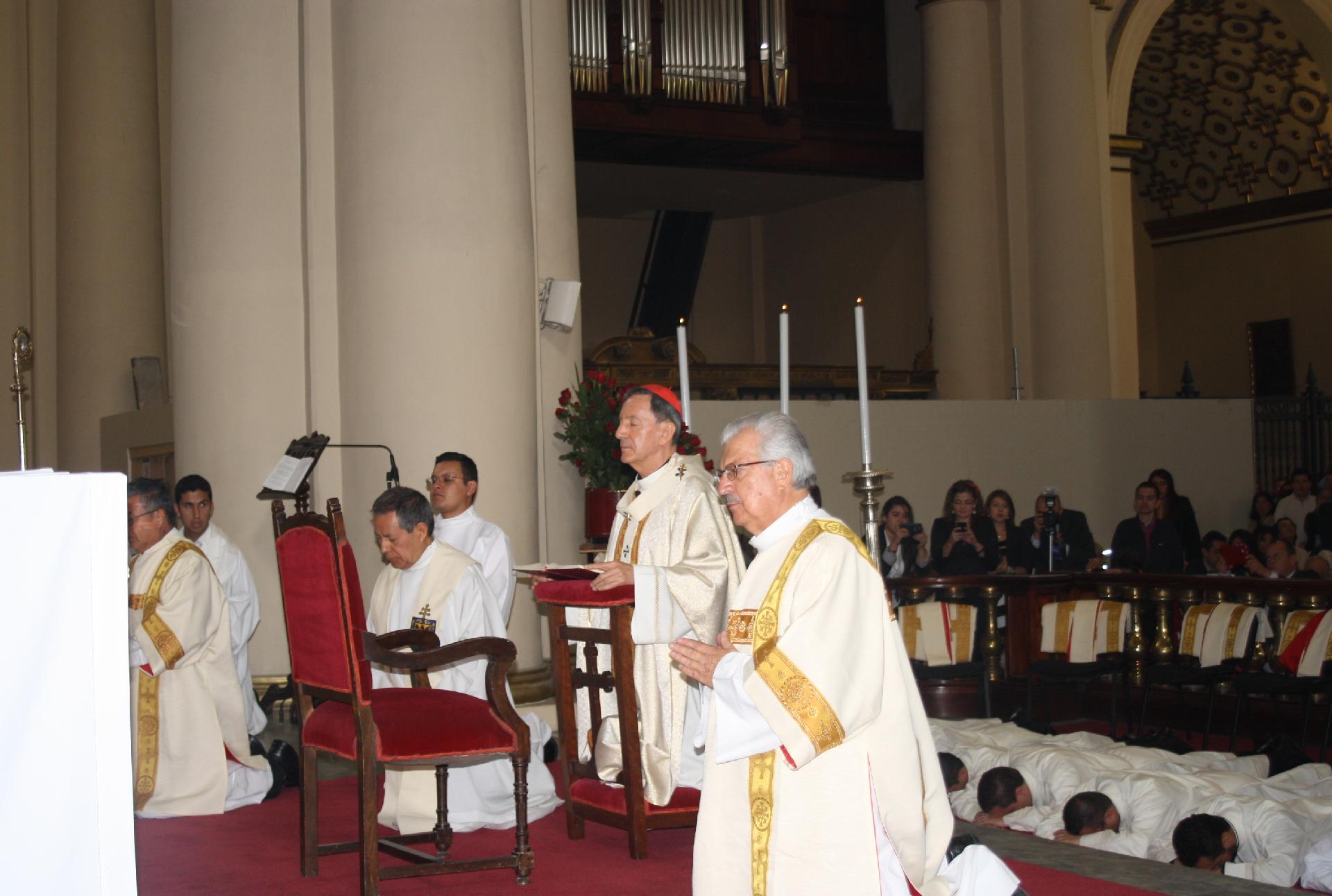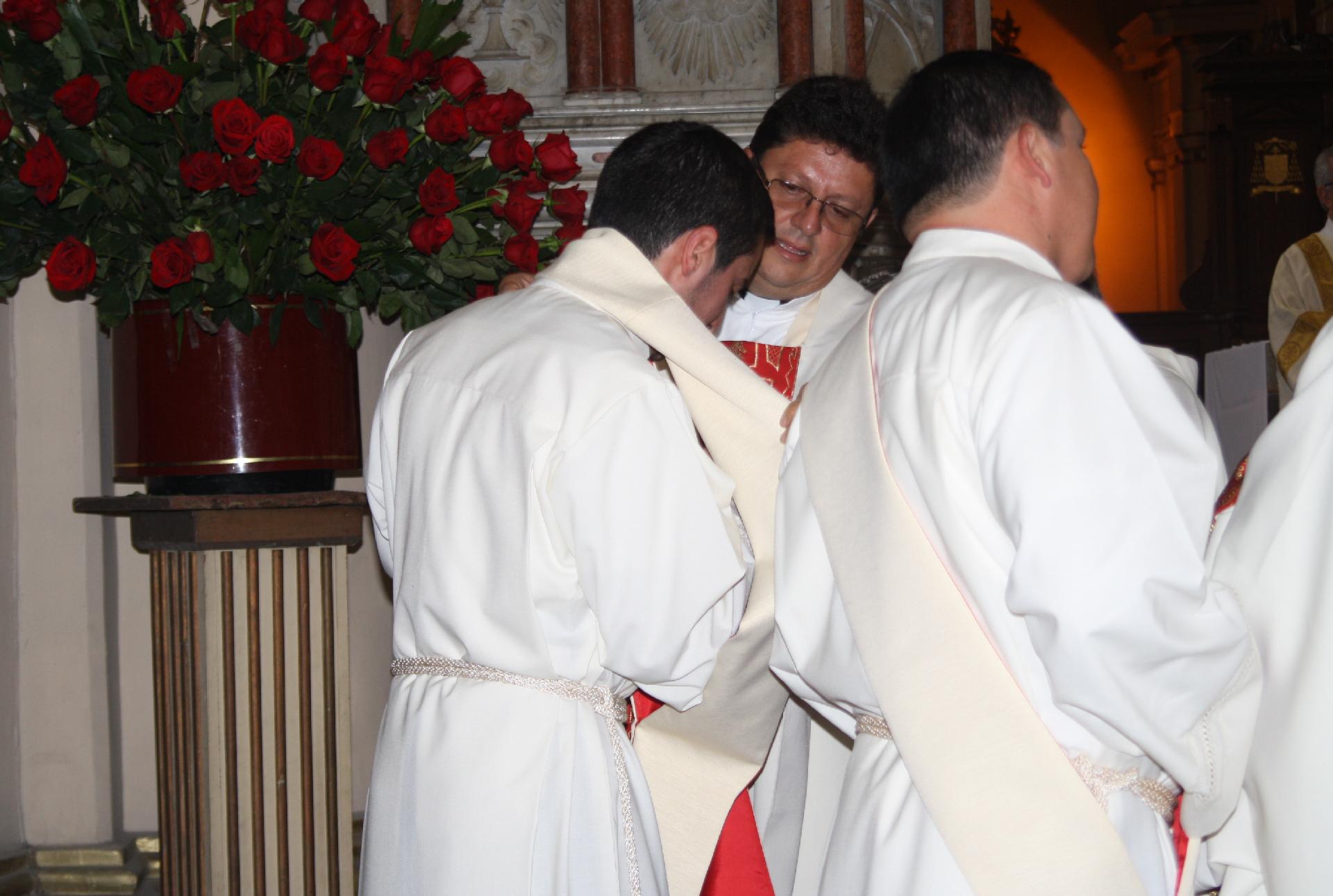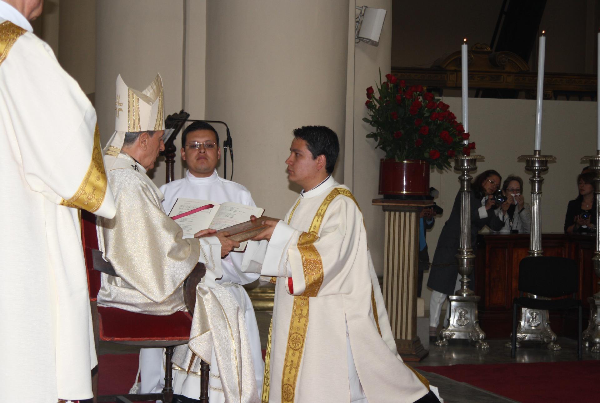 Ya con las vestiduras diaconales, se acercaron al Señor Cardenal quién les hizo la entrega del libro de los Evangelios, diciendo: Recibe el Evangelio de Cristo, del cual has sido constituido mensajero; convierte en fe viva lo que lees, y lo que has hecho fe viva enséñalo, y cumple aquello que has enseñado.