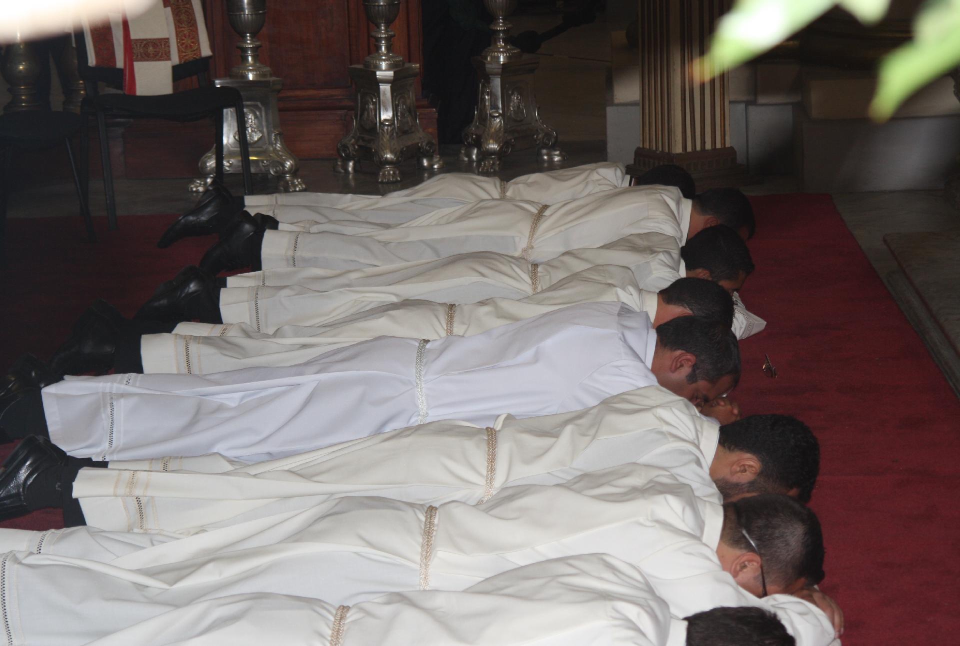 Como uno de los actos más significativos se pide a todos para que oren a Dios Padre para que derrame bondadosamente la gracia de su bendición sobre estos jóvenes que han llamado al orden de los diáconos. Entonces ellos se postran en tierra, dejando su vida y muriendo a su mundo entregando todo por Cristo.